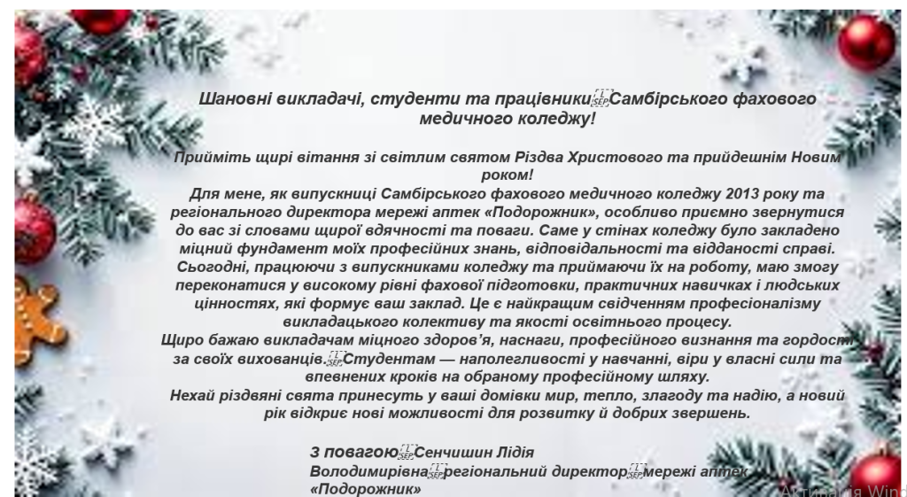 Нехай Різдво принесе мир, радість і натхнення, а новий рік — нові можливості, успіхи в навчанні та здійснення мрій.
